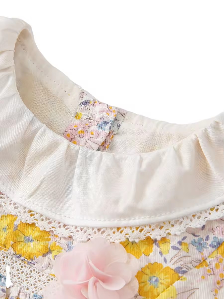Girls' Cotton Floral Dress Casual A-Line Short Sleeve Kurti O-Neck With Flower Decoration for Children 15 Years Below for Summer