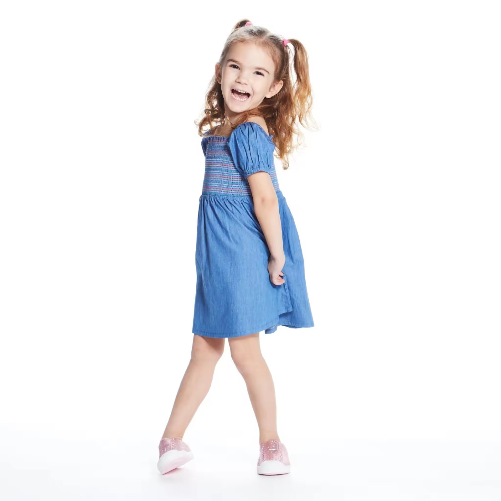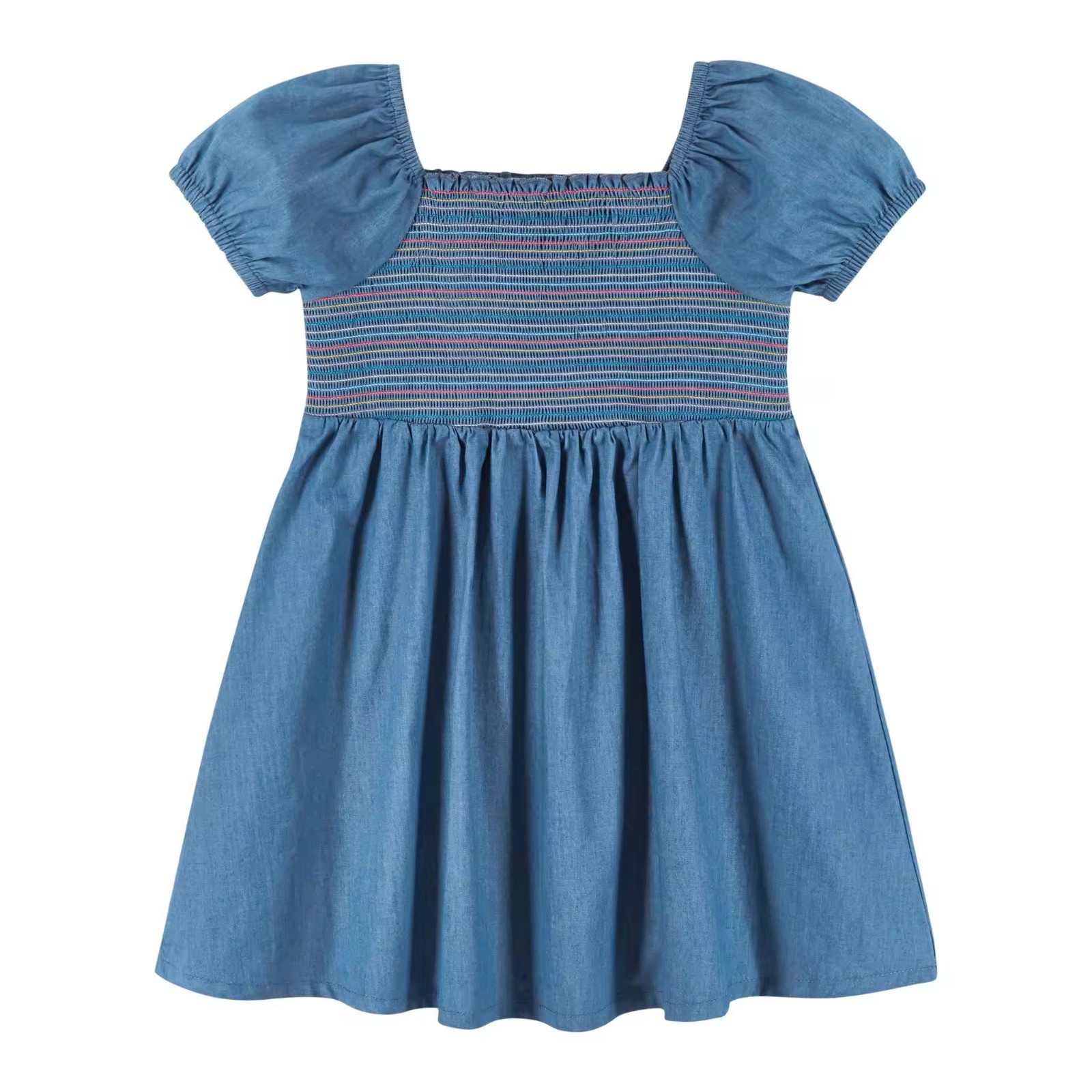 Custom Soft Denim Dress for Toddler Baby Girls Dress Summer Puffy Sleeve Girls Smocked Dresses With Colorful Threads