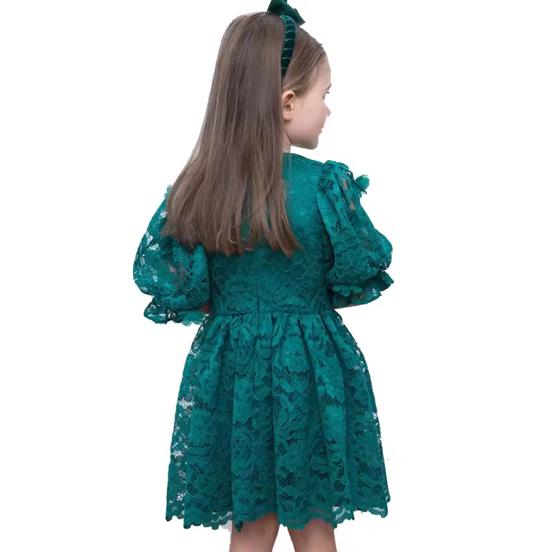 Cotton Hollow-carved Lace Knee-Length Dress With Beautiful Lantern Sleeves Design Girls Dresses